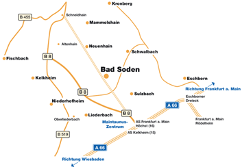Bad Soden liegt zwischen Frankfurt am Main und Wiesbaden, etwas näher zu Frankfurt. Von der A66 kommend fahren Sie an der Abfahrt Bad Soden (MTZ) ab und folgen der Beschilderung nach Bad Soden.